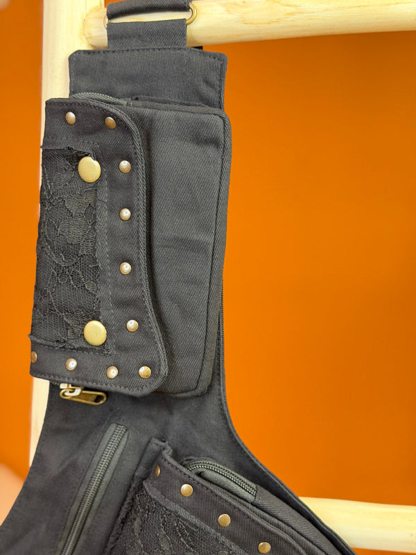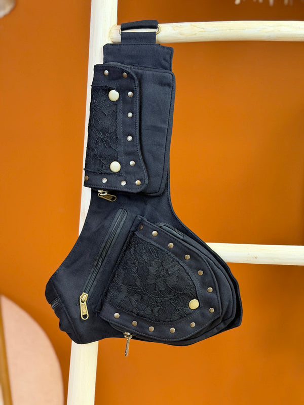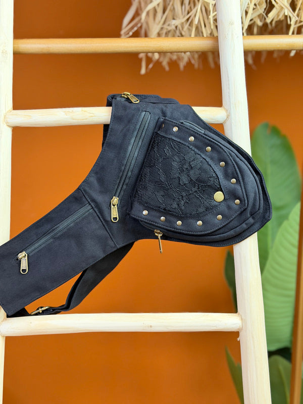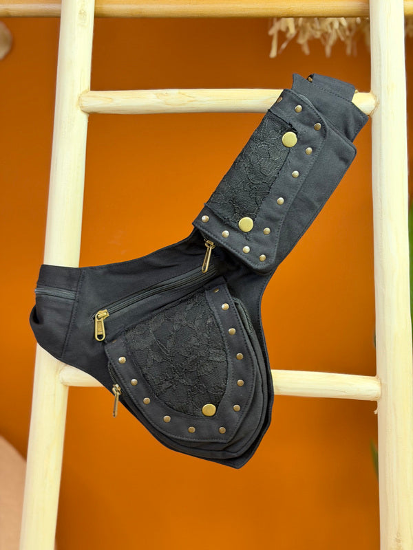 Deze prachtige hipbelt bestaat uit twee tasjes: ƩƩn grotere en ƩƩn kleinere, bevestigd aan een lange, verstelbare riem. Perfect om je essentials dicht bij je te dragen – of je nu op reis bent, een festival bezoekt of gewoon je handen vrij wilt houden.