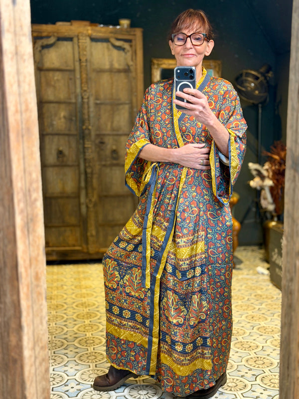 Was diesen Kimono wirklich besonders macht, ist die Verwendung von Upcycling-Sari-Seide in Kombination mit anderen außergewöhnlich schönen Stoffen. Das bedeutet, dass jeder Kimono ein einzigartiges Meisterwerk mit eigenem Charakter und eigener Geschichte ist. Wir bei TwoSisters glauben an Nachhaltigkeit und daran, aus recycelten Materialien etwas Schönes zu schaffen. Mit diesem Kimono tragen Sie nicht nur ein schönes Kleidungsstück, sondern auch ein Stück ethische Mode.
