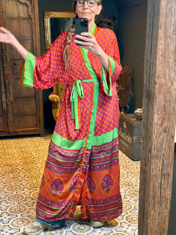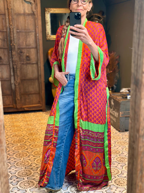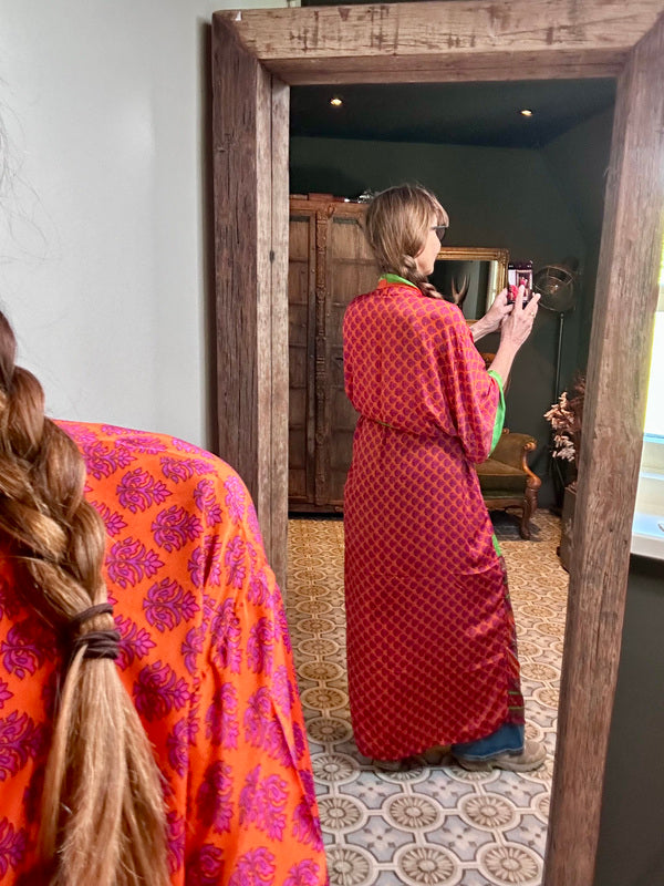 Was diesen Kimono wirklich besonders macht, ist die Verwendung von Upcycling-Sari-Seide in Kombination mit anderen außergewöhnlich schönen Stoffen. Das bedeutet, dass jeder Kimono ein einzigartiges Meisterwerk mit eigenem Charakter und eigener Geschichte ist. Wir bei TwoSisters glauben an Nachhaltigkeit und daran, aus recycelten Materialien etwas Schönes zu schaffen. Mit diesem Kimono tragen Sie nicht nur ein schönes Kleidungsstück, sondern auch ein Stück ethische Mode.