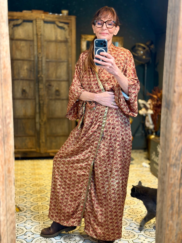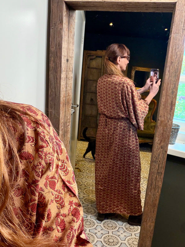 Was diesen Kimono wirklich besonders macht, ist die Verwendung von Upcycling-Sari-Seide in Kombination mit anderen außergewöhnlich schönen Stoffen. Das bedeutet, dass jeder Kimono ein einzigartiges Meisterwerk mit eigenem Charakter und eigener Geschichte ist. Wir bei TwoSisters glauben an Nachhaltigkeit und daran, aus recycelten Materialien etwas Schönes zu schaffen. Mit diesem Kimono tragen Sie nicht nur ein schönes Kleidungsstück, sondern auch ein Stück ethische Mode.