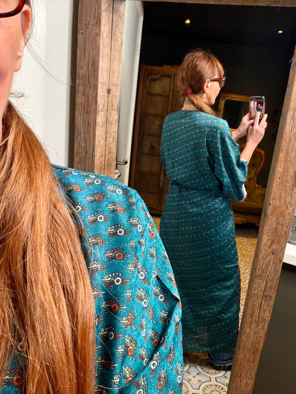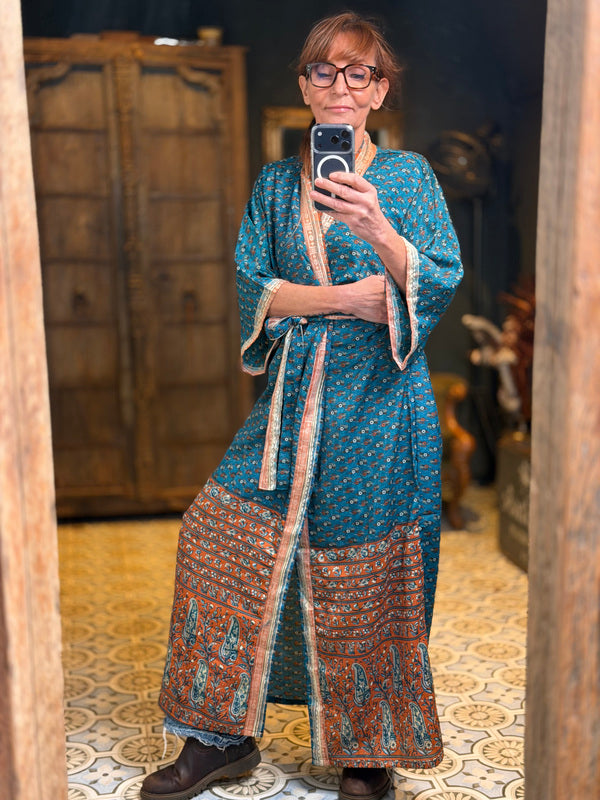 What makes this kimono really special is the use of upcycled Sari silk, combined with other exceptionally beautiful fabrics. This means that every kimono is a unique masterpiece, with its own character and story. At TwoSisters we believe in sustainability and creating something beautiful from recycled materials. With this kimono you are not only wearing a beautiful garment, but also a piece of ethical fashion.