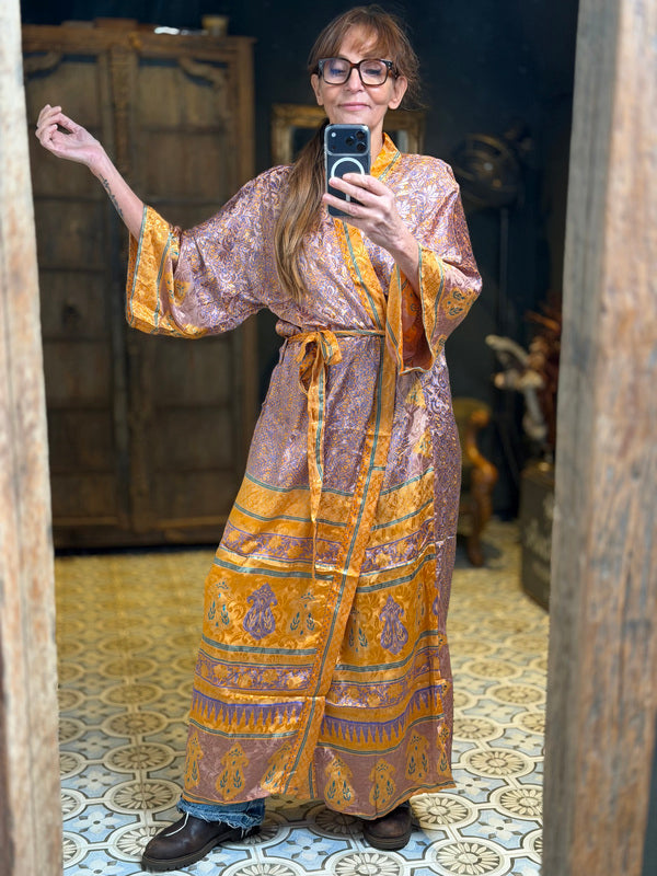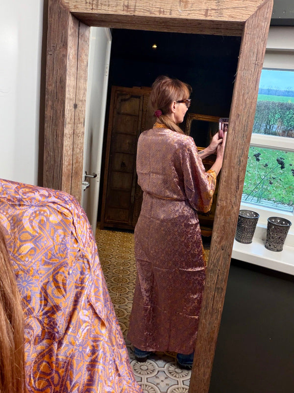 What makes this kimono really special is the use of upcycled Sari silk, combined with other exceptionally beautiful fabrics. This means that every kimono is a unique masterpiece, with its own character and story. At TwoSisters we believe in sustainability and creating something beautiful from recycled materials. With this kimono you are not only wearing a beautiful garment, but also a piece of ethical fashion.