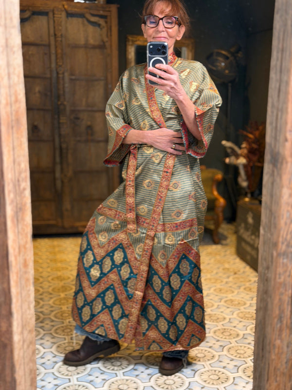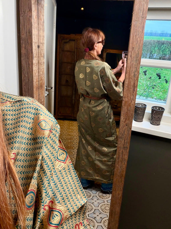What makes this kimono really special is the use of upcycled Sari silk, combined with other exceptionally beautiful fabrics. This means that every kimono is a unique masterpiece, with its own character and story. At TwoSisters we believe in sustainability and creating something beautiful from recycled materials. With this kimono you are not only wearing a beautiful garment, but also a piece of ethical fashion.