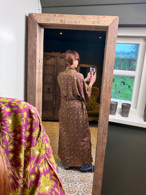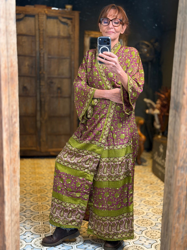 What makes this kimono really special is the use of upcycled Sari silk, combined with other exceptionally beautiful fabrics. This means that every kimono is a unique masterpiece, with its own character and story. At TwoSisters we believe in sustainability and creating something beautiful from recycled materials. With this kimono you are not only wearing a beautiful garment, but also a piece of ethical fashion.