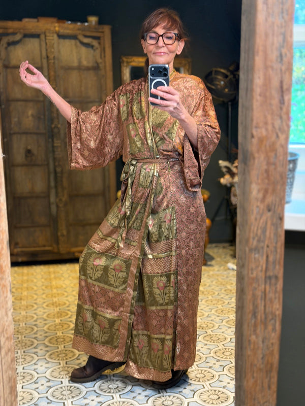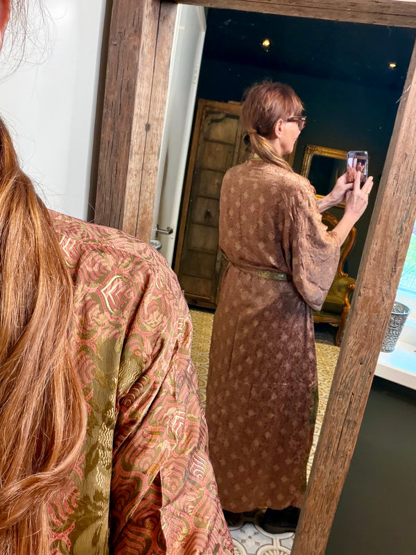 What makes this kimono really special is the use of upcycled Sari silk, combined with other exceptionally beautiful fabrics. This means that every kimono is a unique masterpiece, with its own character and story. At TwoSisters we believe in sustainability and creating something beautiful from recycled materials. With this kimono you are not only wearing a beautiful garment, but also a piece of ethical fashion.