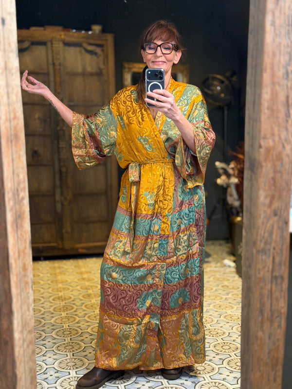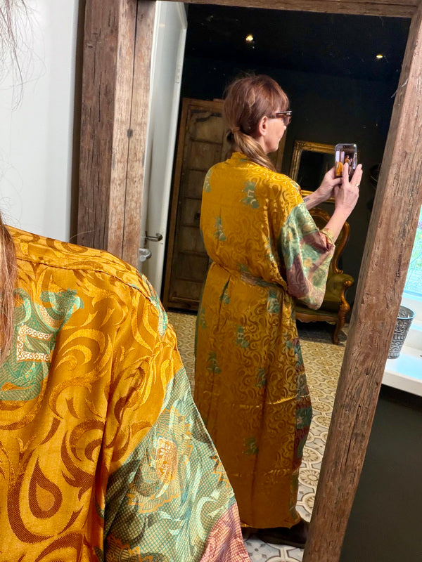 What makes this kimono really special is the use of upcycled Sari silk, combined with other exceptionally beautiful fabrics. This means that every kimono is a unique masterpiece, with its own character and story. At TwoSisters we believe in sustainability and creating something beautiful from recycled materials. With this kimono you are not only wearing a beautiful garment, but also a piece of ethical fashion.