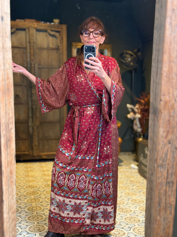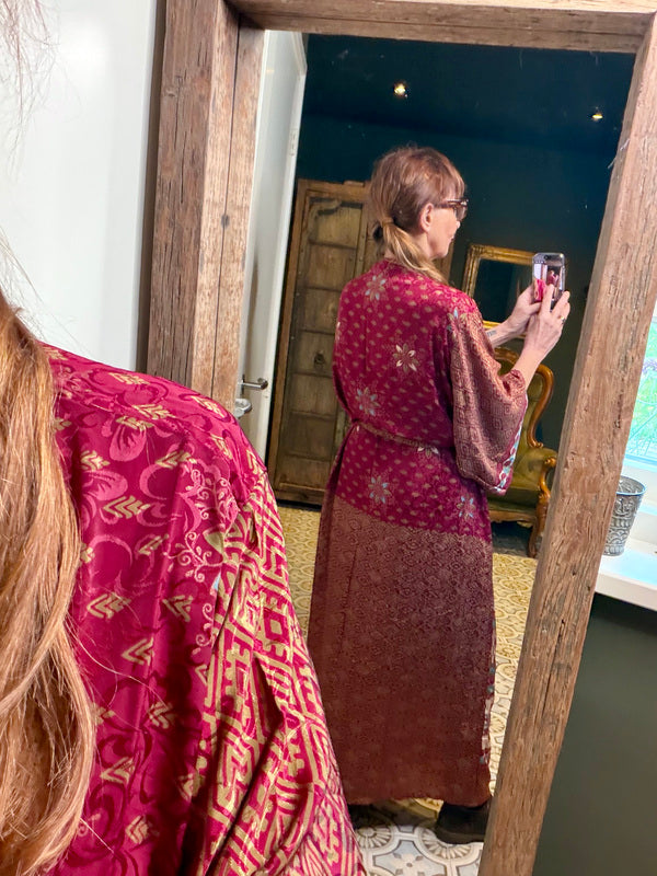What makes this kimono really special is the use of upcycled Sari silk, combined with other exceptionally beautiful fabrics. This means that every kimono is a unique masterpiece, with its own character and story. At TwoSisters we believe in sustainability and creating something beautiful from recycled materials. With this kimono you are not only wearing a beautiful garment, but also a piece of ethical fashion.