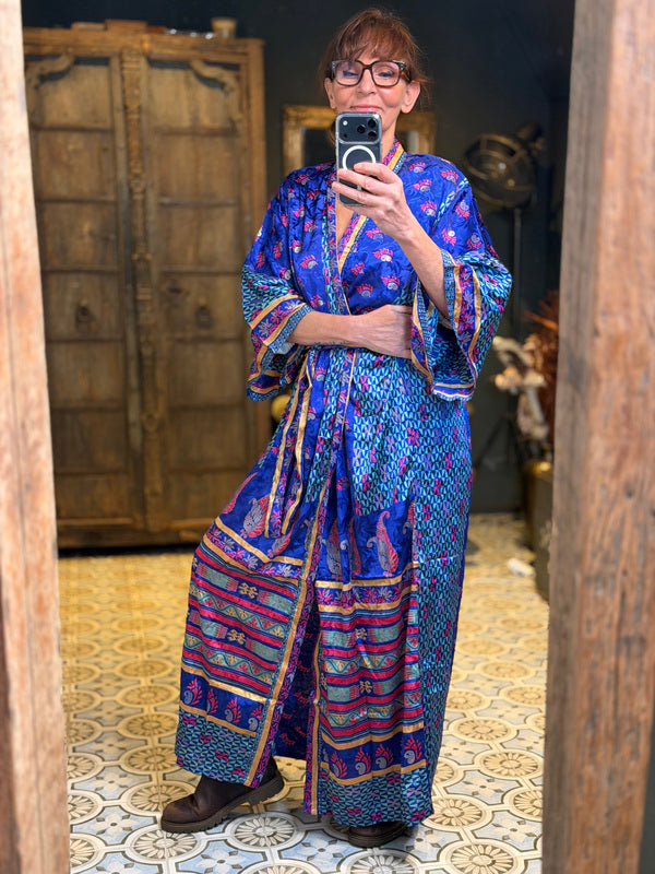 What makes this kimono really special is the use of upcycled Sari silk, combined with other exceptionally beautiful fabrics. This means that every kimono is a unique masterpiece, with its own character and story. At TwoSisters we believe in sustainability and creating something beautiful from recycled materials. With this kimono you are not only wearing a beautiful garment, but also a piece of ethical fashion.