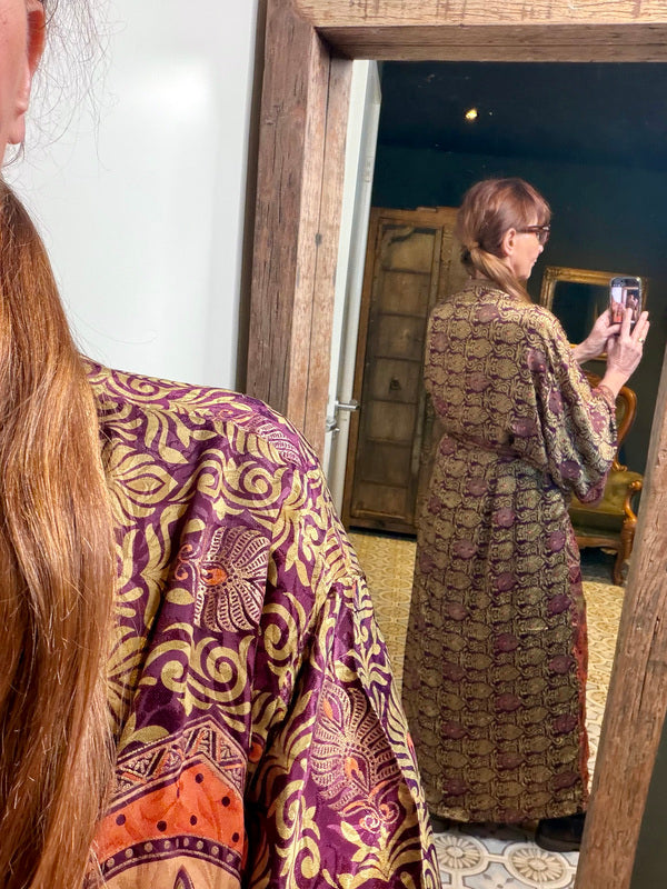What makes this kimono really special is the use of upcycled Sari silk, combined with other exceptionally beautiful fabrics. This means that every kimono is a unique masterpiece, with its own character and story. At TwoSisters we believe in sustainability and creating something beautiful from recycled materials. With this kimono you are not only wearing a beautiful garment, but also a piece of ethical fashion.