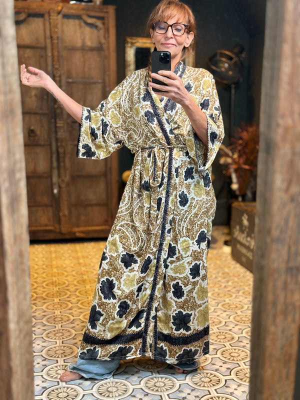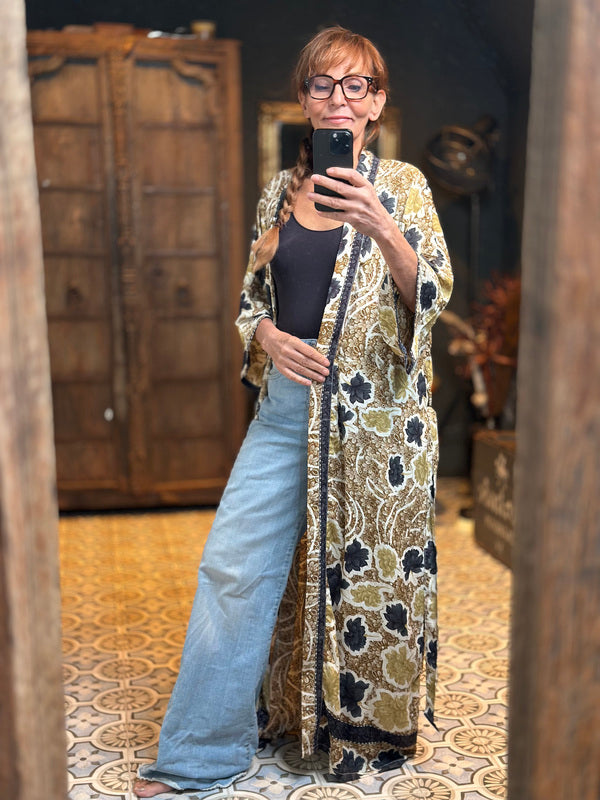 What makes this kimono really special is the use of upcycled Sari silk, combined with other exceptionally beautiful fabrics. This means that every kimono is a unique masterpiece, with its own character and story. At TwoSisters we believe in sustainability and creating something beautiful from recycled materials. With this kimono you are not only wearing a beautiful garment, but also a piece of ethical fashion.