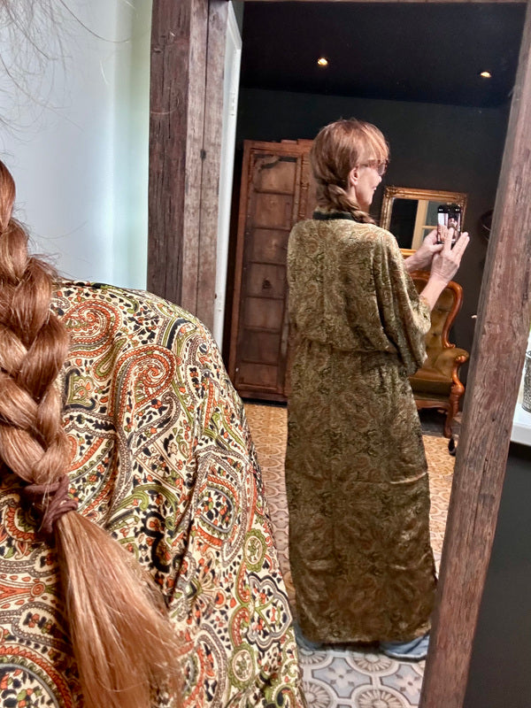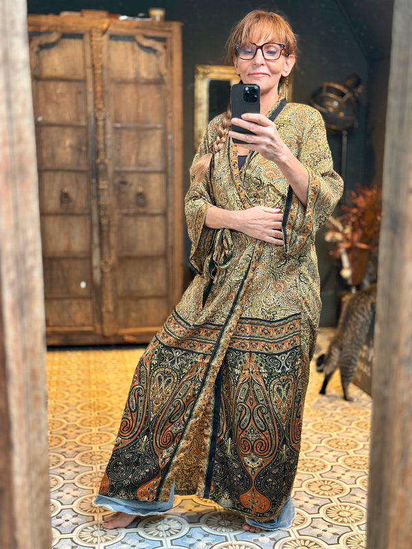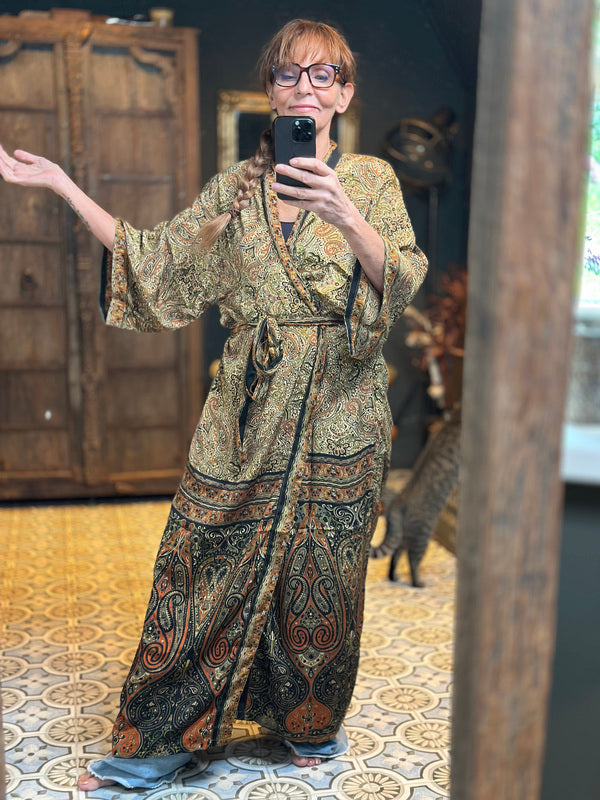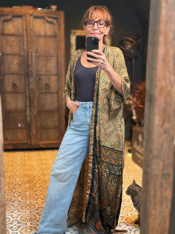 What makes this kimono really special is the use of upcycled Sari silk, combined with other exceptionally beautiful fabrics. This means that every kimono is a unique masterpiece, with its own character and story. At TwoSisters we believe in sustainability and creating something beautiful from recycled materials. With this kimono you are not only wearing a beautiful garment, but also a piece of ethical fashion.