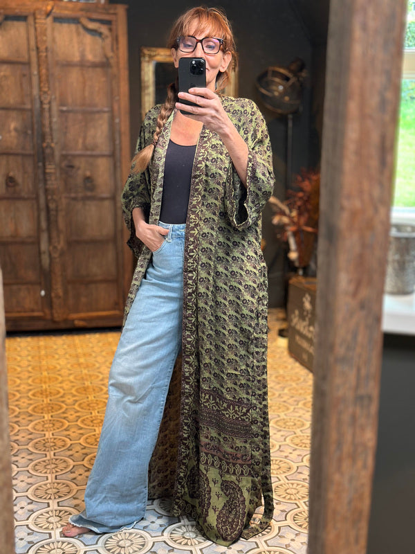 What makes this kimono really special is the use of upcycled Sari silk, combined with other exceptionally beautiful fabrics. This means that every kimono is a unique masterpiece, with its own character and story. At TwoSisters we believe in sustainability and creating something beautiful from recycled materials. With this kimono you are not only wearing a beautiful garment, but also a piece of ethical fashion.