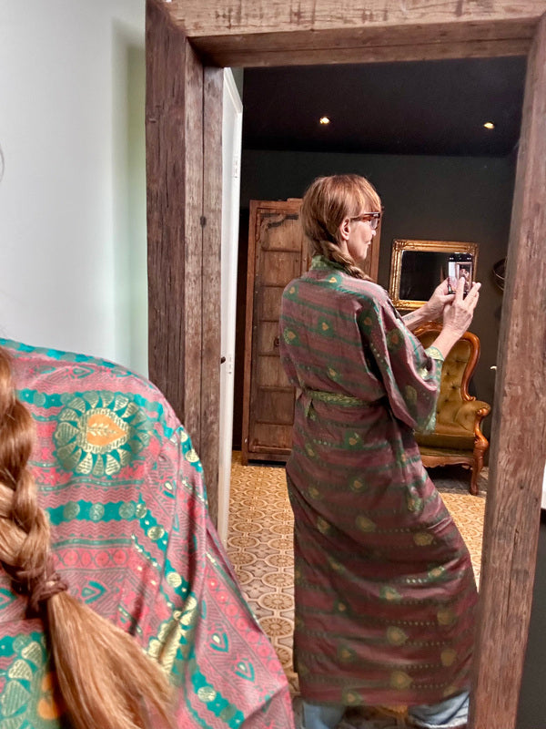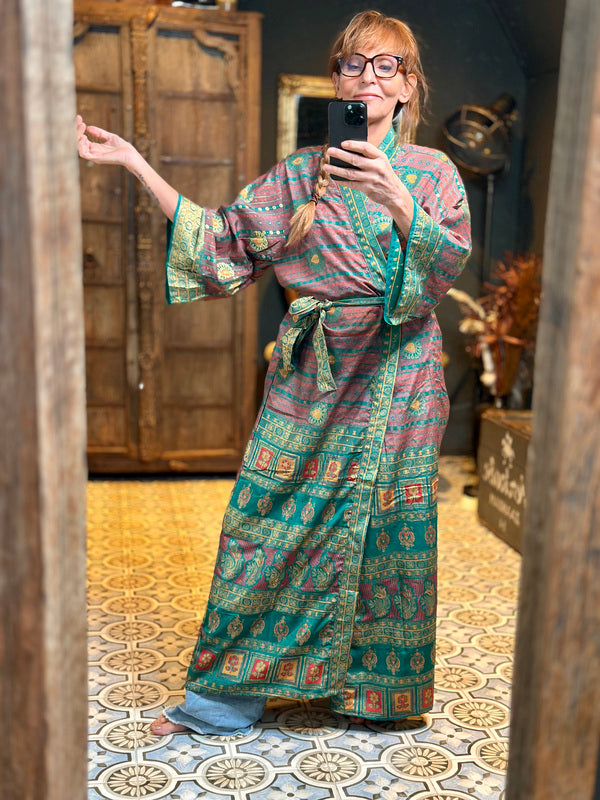 What makes this kimono really special is the use of upcycled Sari silk, combined with other exceptionally beautiful fabrics. This means that every kimono is a unique masterpiece, with its own character and story. At TwoSisters we believe in sustainability and creating something beautiful from recycled materials. With this kimono you are not only wearing a beautiful garment, but also a piece of ethical fashion.