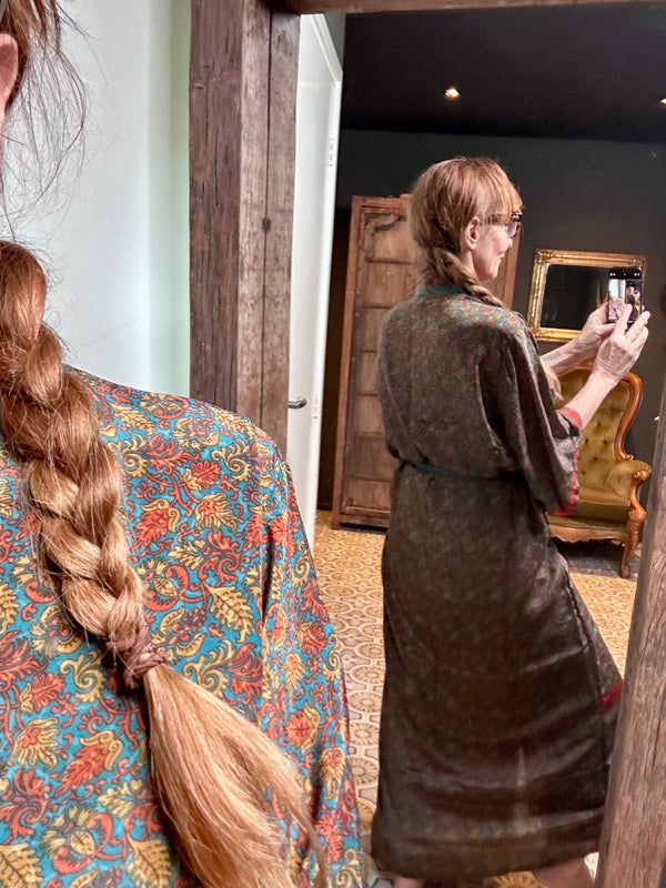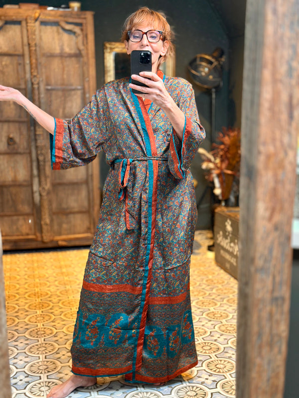 What makes this kimono really special is the use of upcycled Sari silk, combined with other exceptionally beautiful fabrics. This means that every kimono is a unique masterpiece, with its own character and story. At TwoSisters we believe in sustainability and creating something beautiful from recycled materials. With this kimono you are not only wearing a beautiful garment, but also a piece of ethical fashion.