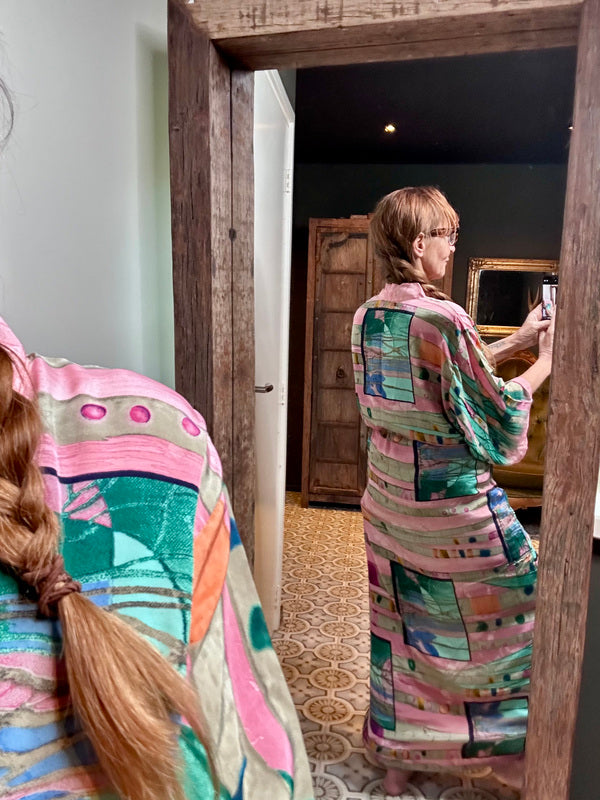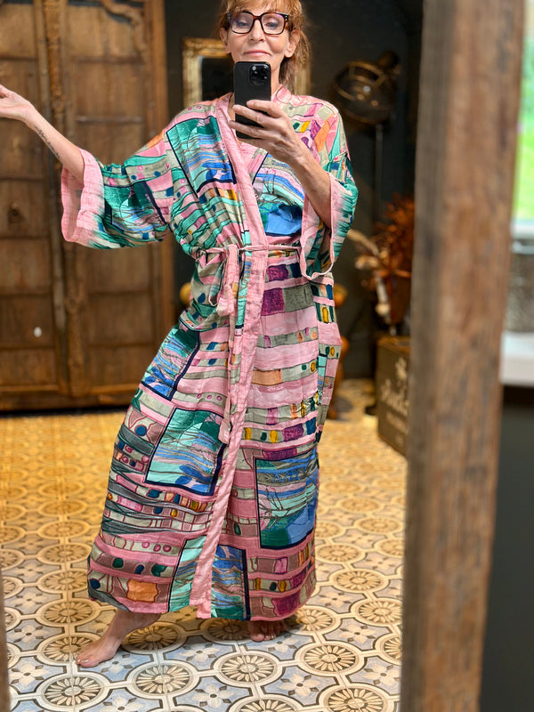 What makes this kimono really special is the use of upcycled Sari silk, combined with other exceptionally beautiful fabrics. This means that every kimono is a unique masterpiece, with its own character and story. At TwoSisters we believe in sustainability and creating something beautiful from recycled materials. With this kimono you are not only wearing a beautiful garment, but also a piece of ethical fashion.