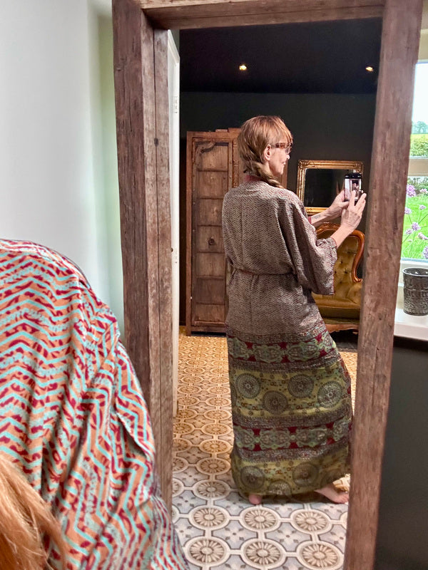 What makes this kimono really special is the use of upcycled Sari silk, combined with other exceptionally beautiful fabrics. This means that every kimono is a unique masterpiece, with its own character and story. At TwoSisters we believe in sustainability and creating something beautiful from recycled materials. With this kimono you are not only wearing a beautiful garment, but also a piece of ethical fashion.