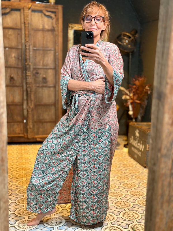 What makes this kimono really special is the use of upcycled Sari silk, combined with other exceptionally beautiful fabrics. This means that every kimono is a unique masterpiece, with its own character and story. At TwoSisters we believe in sustainability and creating something beautiful from recycled materials. With this kimono you are not only wearing a beautiful garment, but also a piece of ethical fashion.
