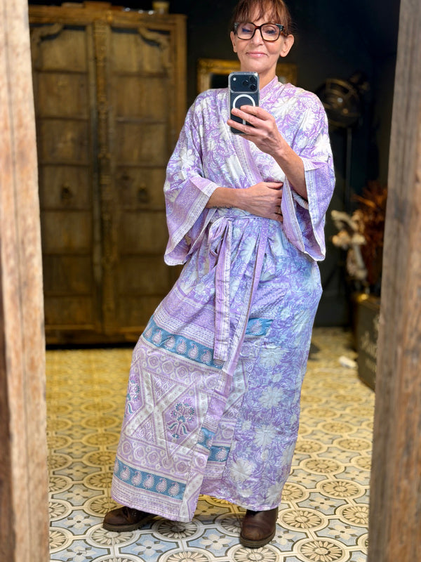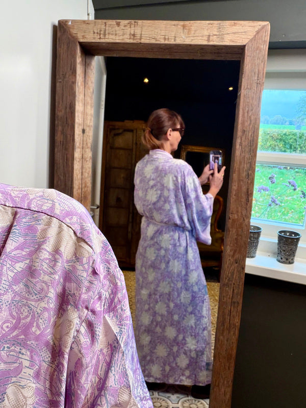 What makes this kimono really special is the use of upcycled Sari silk, combined with other exceptionally beautiful fabrics. This means that every kimono is a unique masterpiece, with its own character and story. At TwoSisters we believe in sustainability and creating something beautiful from recycled materials. With this kimono you are not only wearing a beautiful garment, but also a piece of ethical fashion.