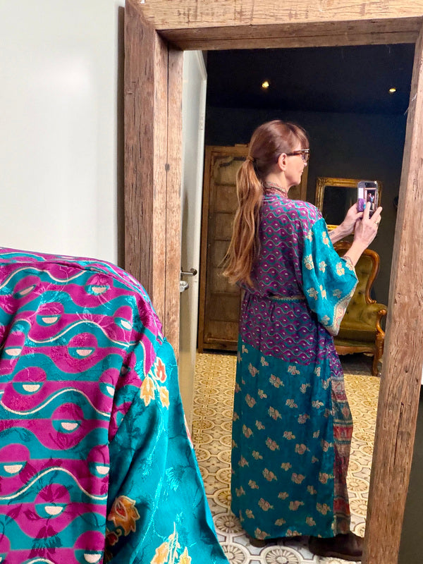 What makes this kimono really special is the use of upcycled Sari silk, combined with other exceptionally beautiful fabrics. This means that every kimono is a unique masterpiece, with its own character and story. At TwoSisters we believe in sustainability and creating something beautiful from recycled materials. With this kimono you are not only wearing a beautiful garment, but also a piece of ethical fashion.