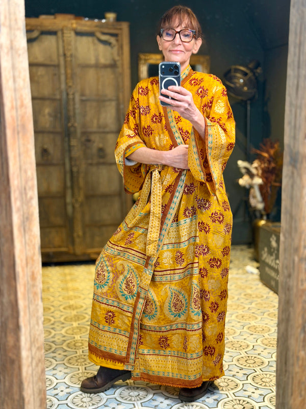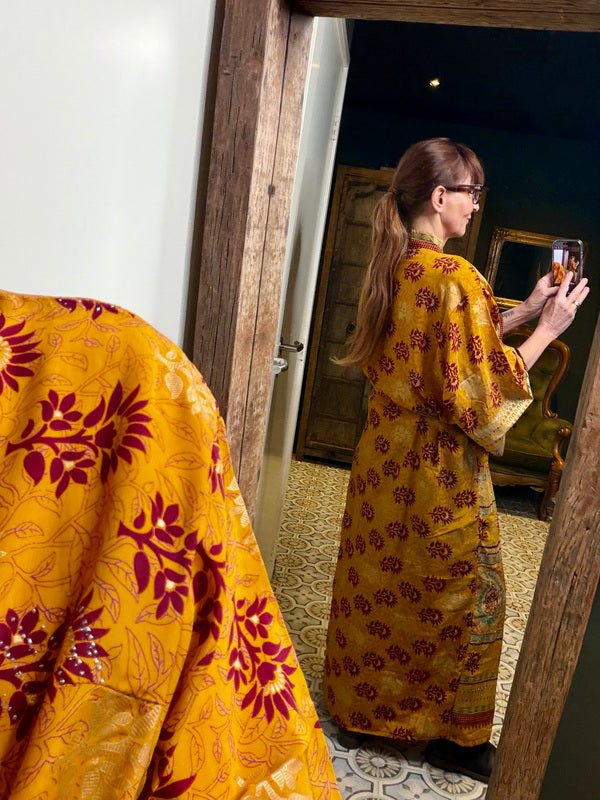 What makes this kimono really special is the use of upcycled Sari silk, combined with other exceptionally beautiful fabrics. This means that every kimono is a unique masterpiece, with its own character and story. At TwoSisters we believe in sustainability and creating something beautiful from recycled materials. With this kimono you are not only wearing a beautiful garment, but also a piece of ethical fashion.