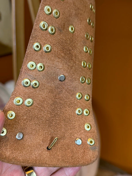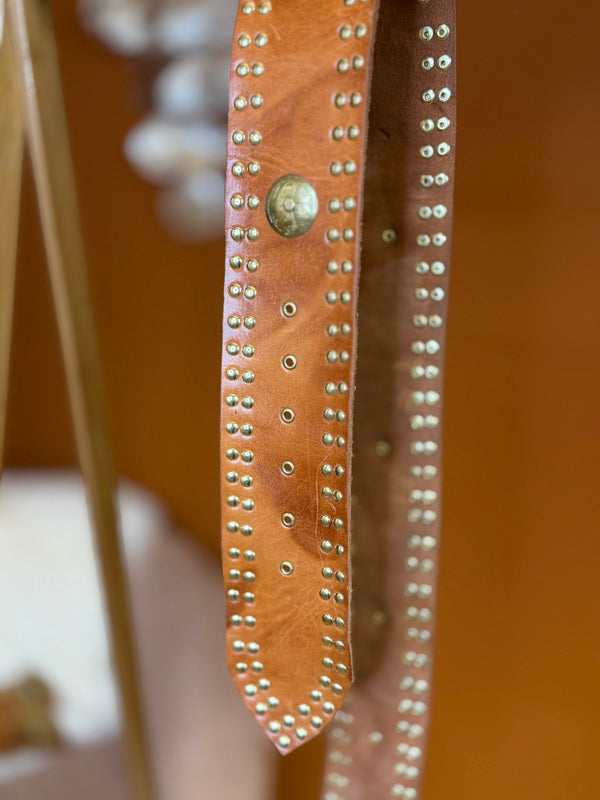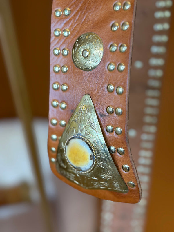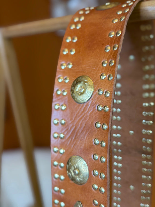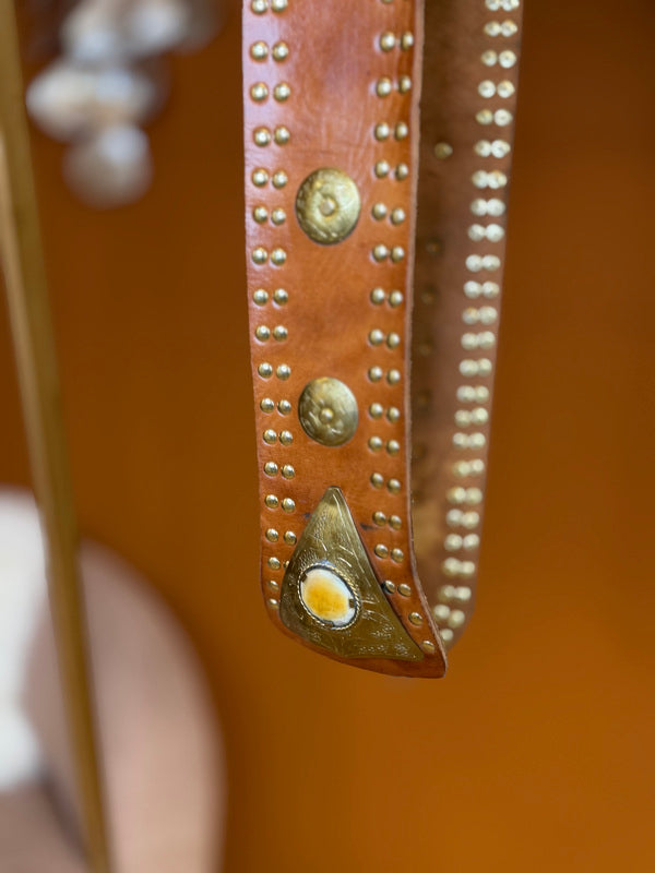 Deze riem is ongelooflijk bijzonder en speciaal. Met de hand gemaakt van stevig leer, rijk versierd met studs en een prachtige sluiting. Je sluit die riem met een pinnetje!