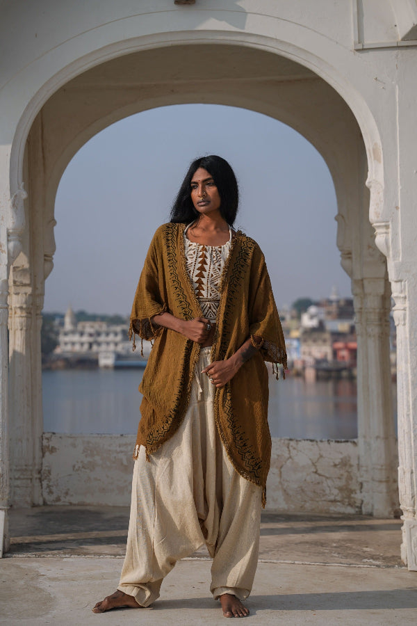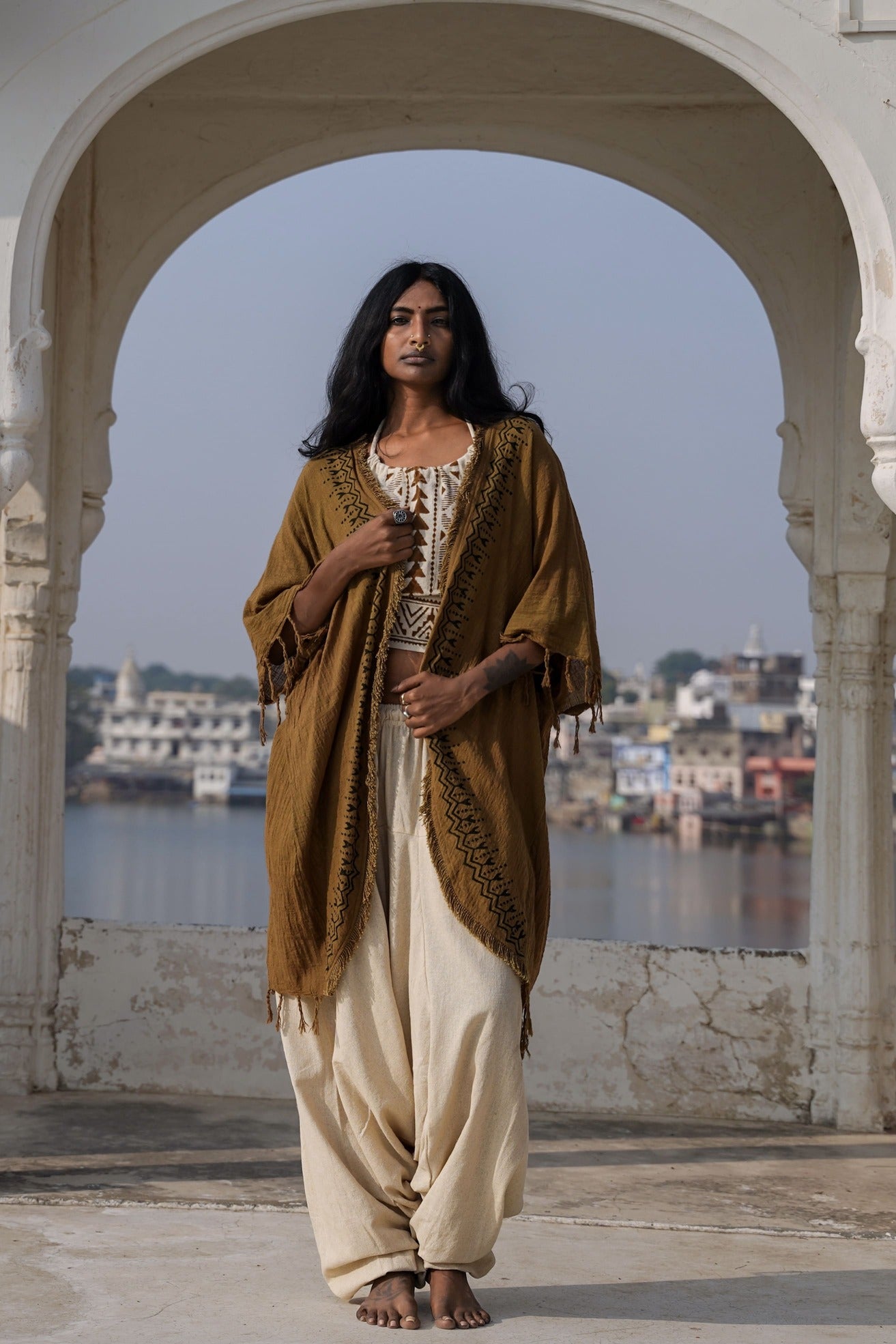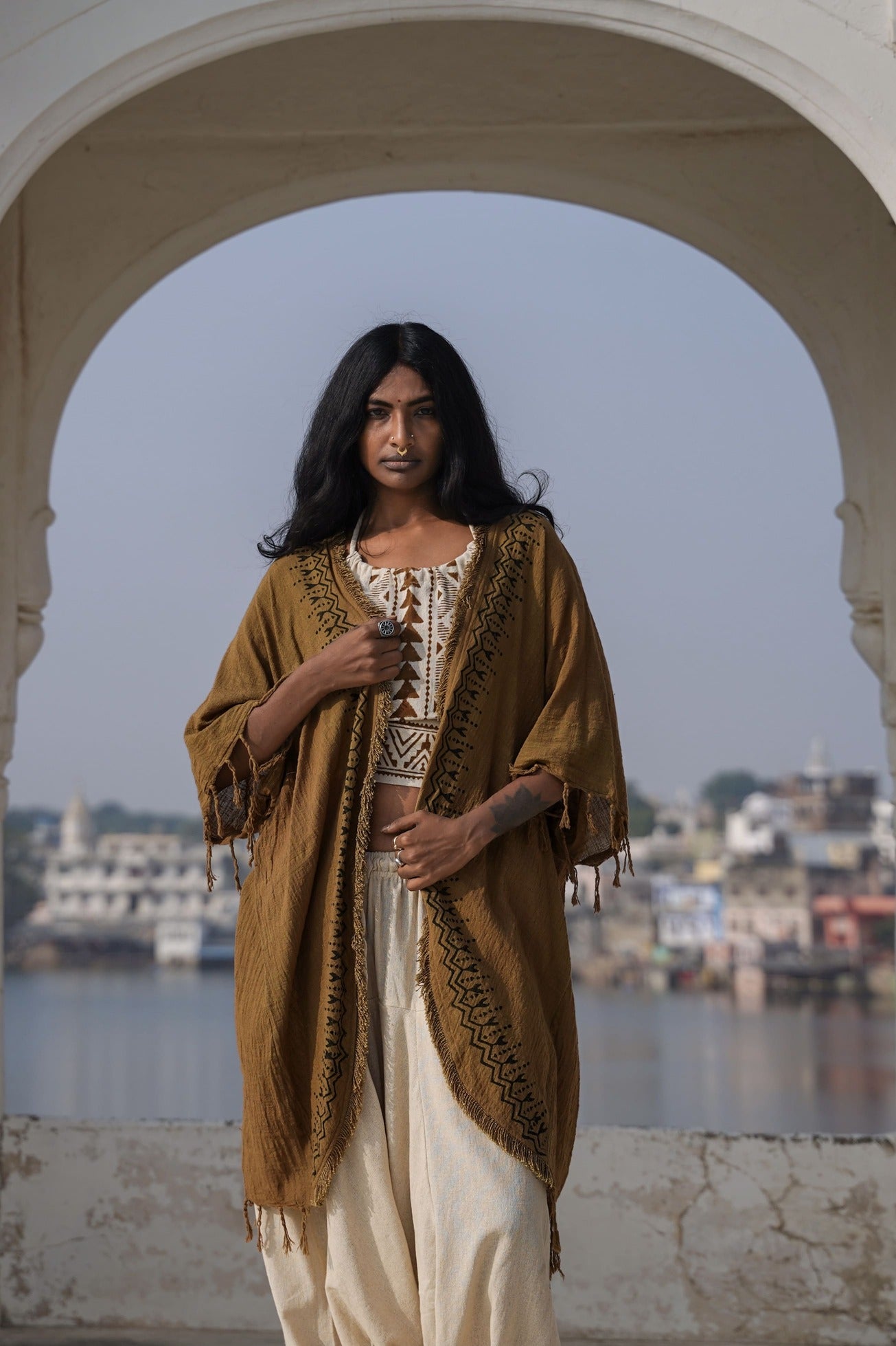 What makes this kimono really special are the delicate fringes that run along the sleeves, the entire front and the back. And last but not least the hand-applied Aztec block print. They add a playful and bohemian touch, perfect for a stylish, relaxed look.