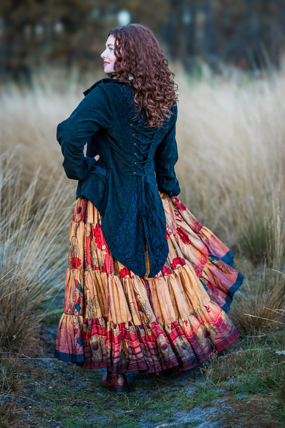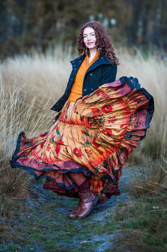 All our silk skirts are made from upcycled saris, vintage saris, meaning they were worn by an Indian woman. Her spirit lives on in these stunningly beautiful skirts.
