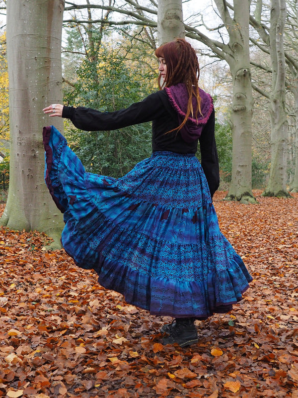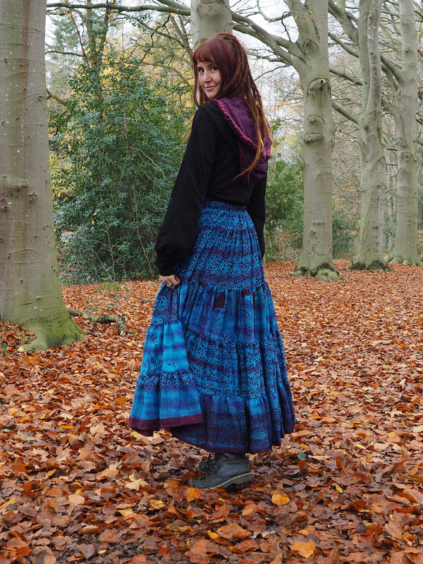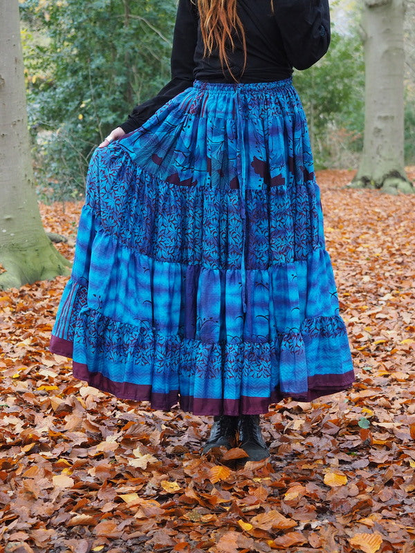 All our silk skirts are made from upcycled saris, vintage saris, meaning they were worn by an Indian woman. Her spirit lives on in these stunningly beautiful skirts.