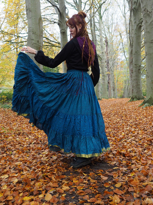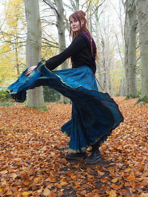 All our silk skirts are made from upcycled saris, vintage saris, meaning they were worn by an Indian woman. Her spirit lives on in these stunningly beautiful skirts.
