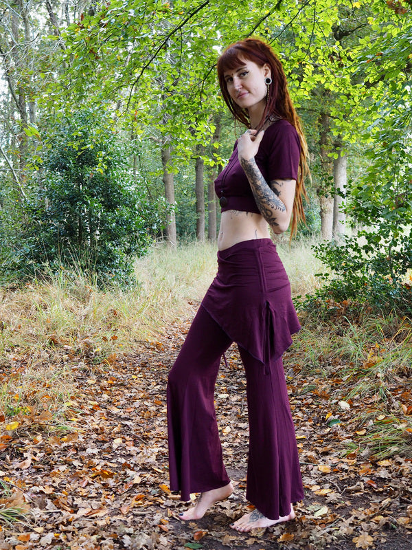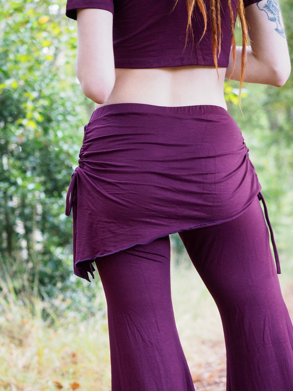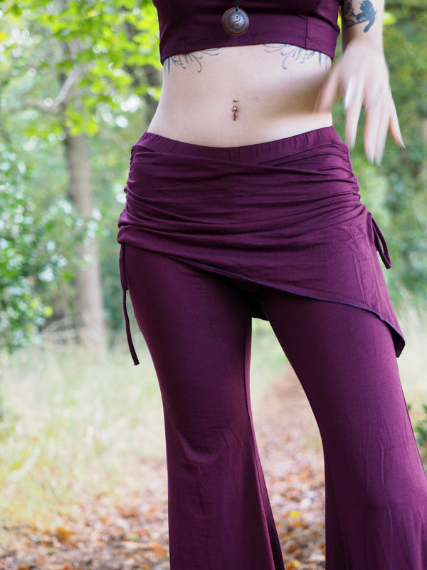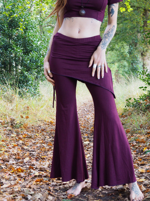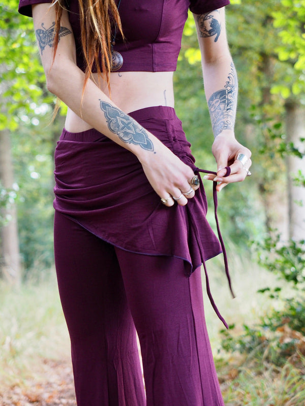 Deze prachtige yoga broek met flaired pijpen is gemaakt van een zachte, rekbare stof die met je meebeweegt. Over de broek valt een asymmetrisch rokje dat je aan beide zijden kunt aansnoeren voor een speels en flatterend effect – een echte Two Sisters touch. Het rokje zit overigens vast aan de pant:-)