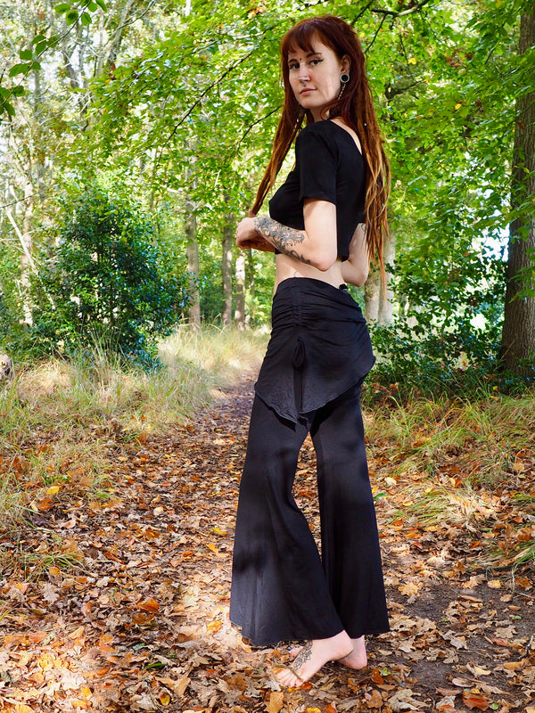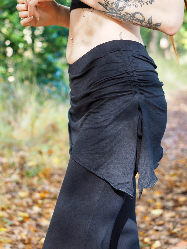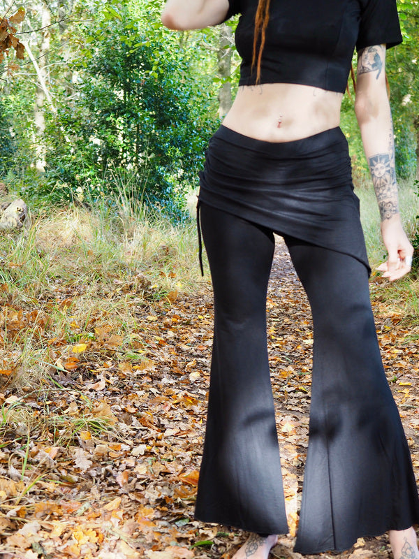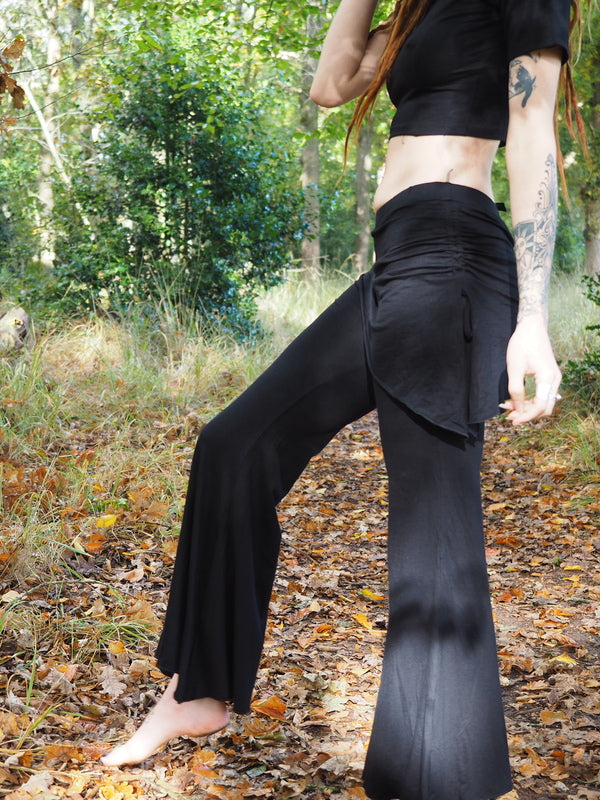 Deze prachtige yoga broek met flaired pijpen is gemaakt van een zachte, rekbare stof die met je meebeweegt. Over de broek valt een asymmetrisch rokje dat je aan beide zijden kunt aansnoeren voor een speels en flatterend effect – een echte Two Sisters touch. Het rokje zit overigens vast aan de pant:-)