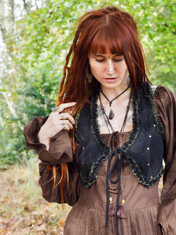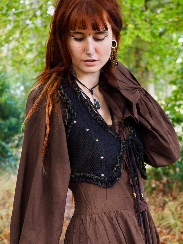 De corsetsluiting aan de achterkant zorgt voor een flatterende pasvorm en een vleugje middeleeuwse elegantie, terwijl de studs en kantafwerking rondom het vestje die typische Two Sisters signatuur geven.