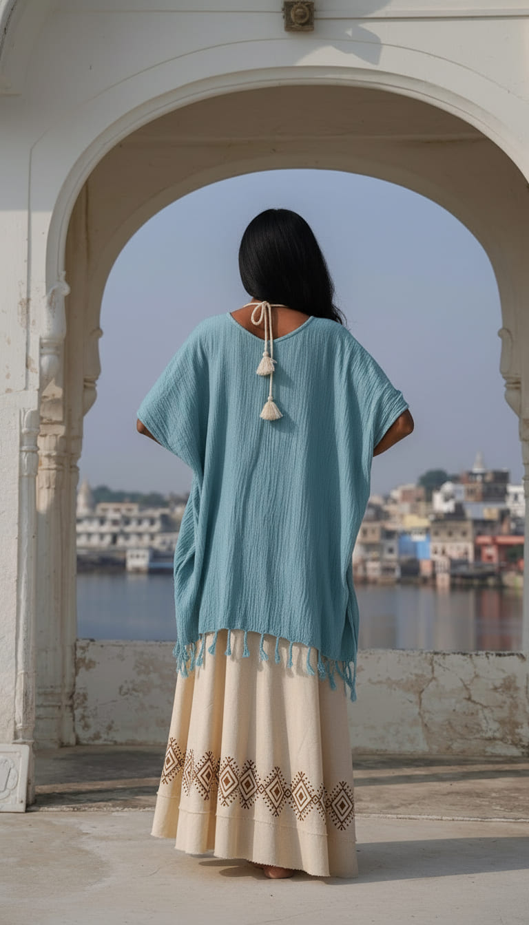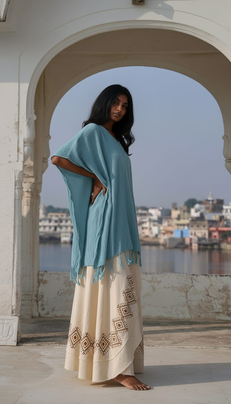 Deze prachtige poncho is gemaakt van ultradunne, ademende katoen die zacht aanvoelt op de huid. Dankzij de gesloten zijpanden en de handige openingen voor de armen biedt de poncho niet alleen comfort, maar ook een verfijnde uitstraling.