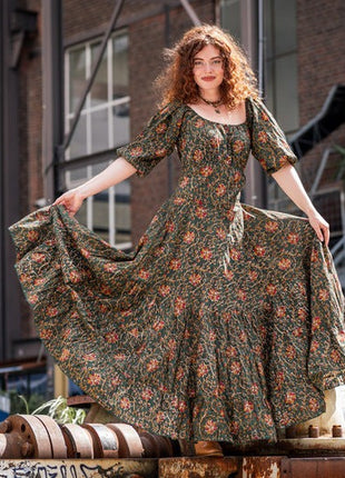 Vanuit onder de Taille loopt de jurk prachtig wijd uit. Het smockelastiek op de rug zorgt ervoor dat je taille prachtig geaccentueerd wordt, en dat de jurk nog steeds comfortabel zit! Het smockelastiek kun je losser en strakker maken met een koord (Corset sluiting) Wat de jurk een magisch geheel geeft. De mouwen komen tot over de elleboog en zijn wederom gezoomd met elastiek.