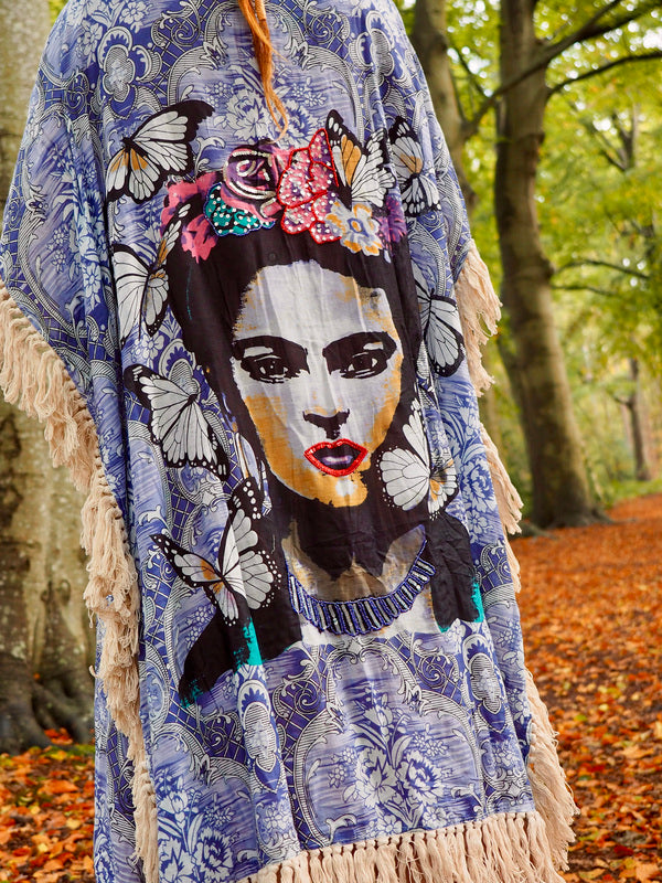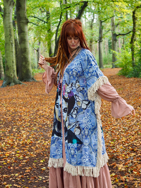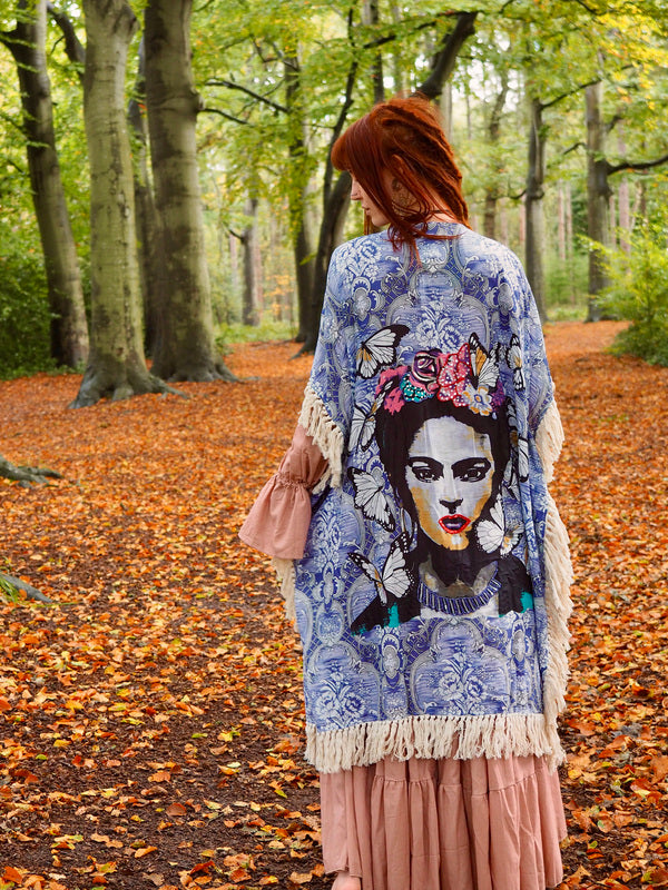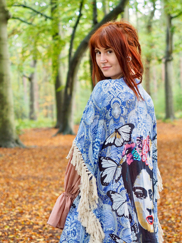 Soms kom ik op mijn reizen in India iets tegen dat meteen magie ademt. Deze bijzondere kimono vond ik in een klein winkeltje in India, een echte hidden treasure. Handgemaakt van 100% katoen, met een levendig Frida-achtig portret, omlijst door zachte franjes en een bohemian print vol kleur en karakter.