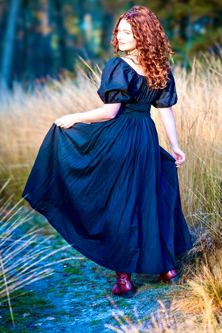 Deze jurk heeft een strak bovenlijfje dat prachtig aansluit en loopt wijd uit naar de onderkant, wat zorgt voor een flatterend silhouet. De elegante halslijn is afgewerkt met elastiek, waardoor hij subtiel en comfortabel om je lichaam valt. De schattige pofmouwtjes zijn eveneens voorzien van elastiek, wat ze niet alleen stijlvol maakt, maar ook geschikt voor elke vrouw. Niet te vergeten! De jurk heeft twee heerlijke steekzakken!