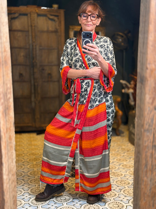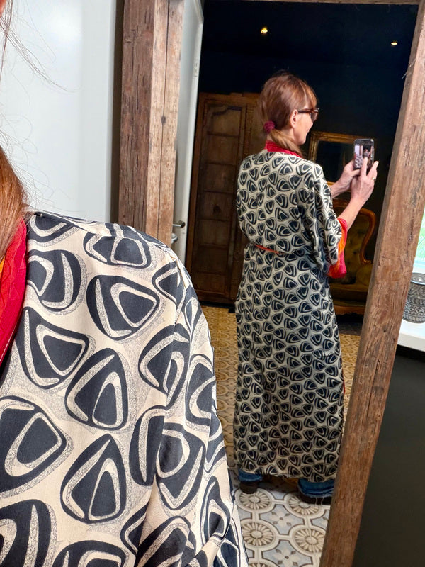 Wat deze kimono echt bijzonder maakt, is het gebruik van upcycled Sari zijde, gecombineerd met andere uitzonderlijk mooie stoffen. Dit betekent dat elke kimono een uniek meesterwerk is, met zijn eigen karakter en verhaal. Bij TwoSisters geloven we in duurzaamheid en het creëren van iets moois uit hergebruikte materialen. Met deze kimono draag je niet alleen een prachtig kledingstuk, maar ook een stukje ethische mode.