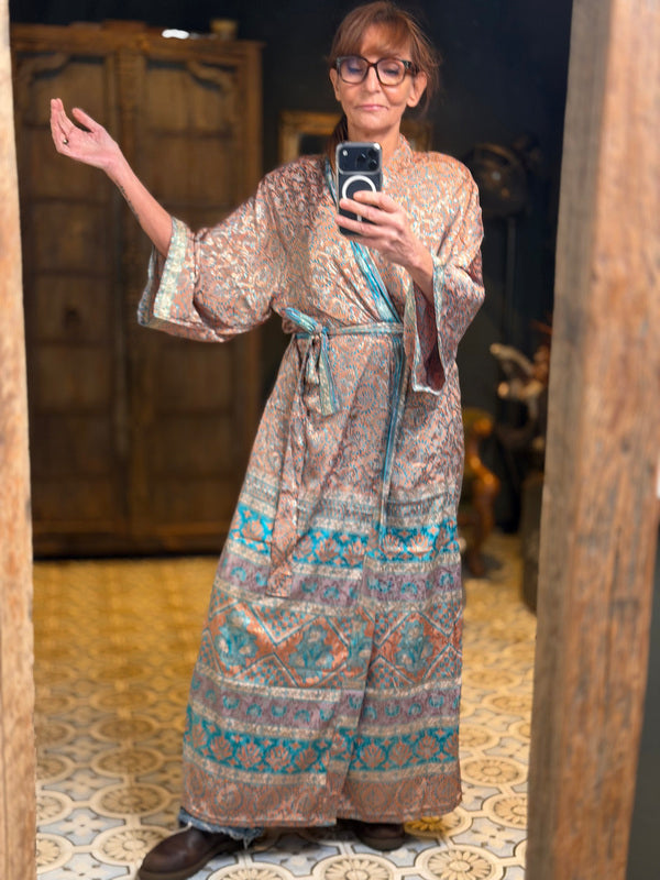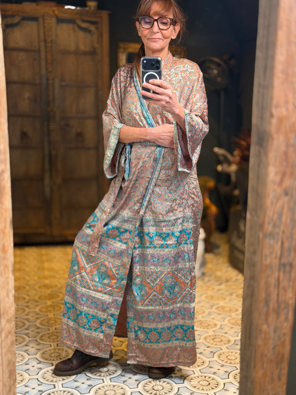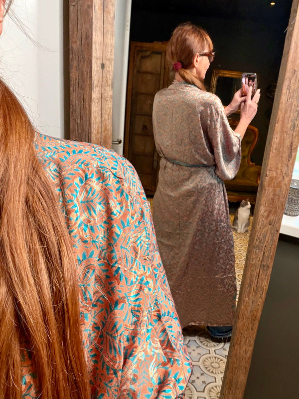 Wat deze kimono echt bijzonder maakt, is het gebruik van upcycled Sari zijde, gecombineerd met andere uitzonderlijk mooie stoffen. Dit betekent dat elke kimono een uniek meesterwerk is, met zijn eigen karakter en verhaal. Bij TwoSisters geloven we in duurzaamheid en het creëren van iets moois uit hergebruikte materialen. Met deze kimono draag je niet alleen een prachtig kledingstuk, maar ook een stukje ethische mode.