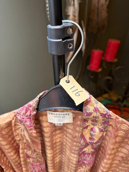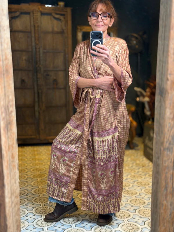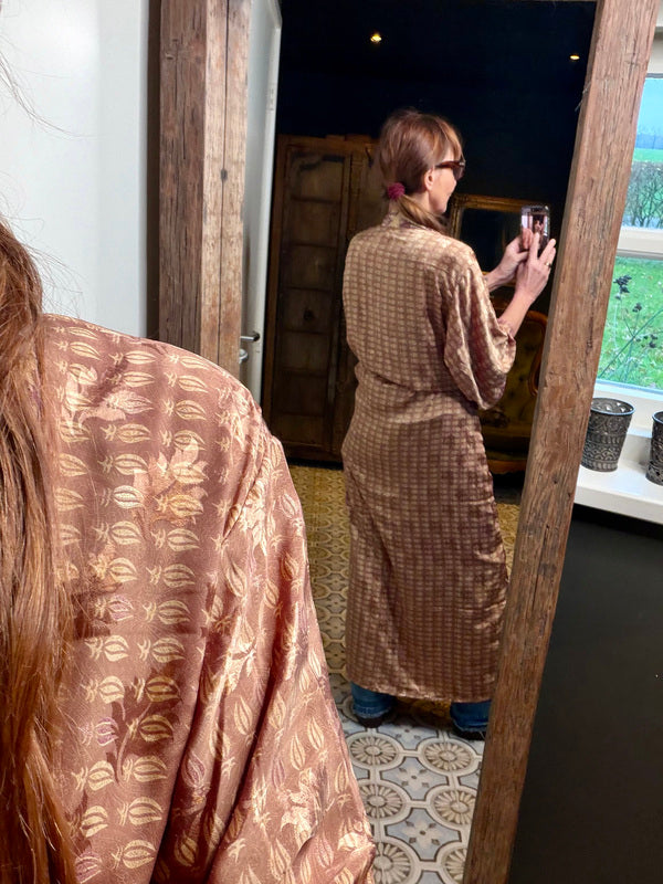 Wat deze kimono echt bijzonder maakt, is het gebruik van upcycled Sari zijde, gecombineerd met andere uitzonderlijk mooie stoffen. Dit betekent dat elke kimono een uniek meesterwerk is, met zijn eigen karakter en verhaal. Bij TwoSisters geloven we in duurzaamheid en het creëren van iets moois uit hergebruikte materialen. Met deze kimono draag je niet alleen een prachtig kledingstuk, maar ook een stukje ethische mode.