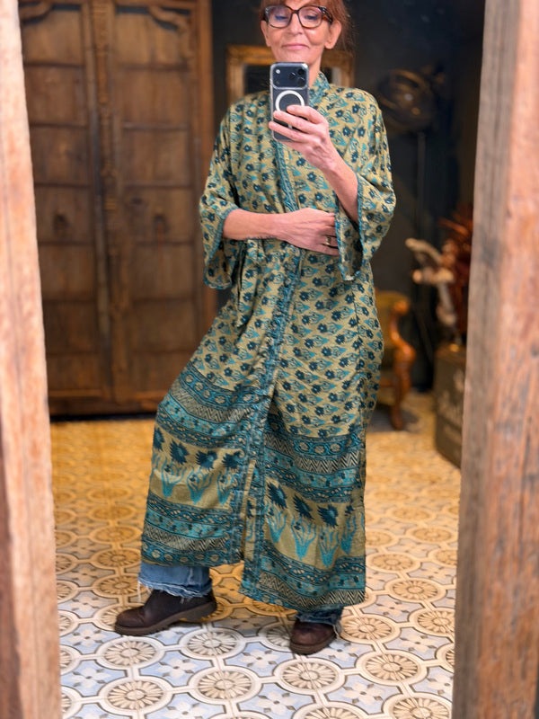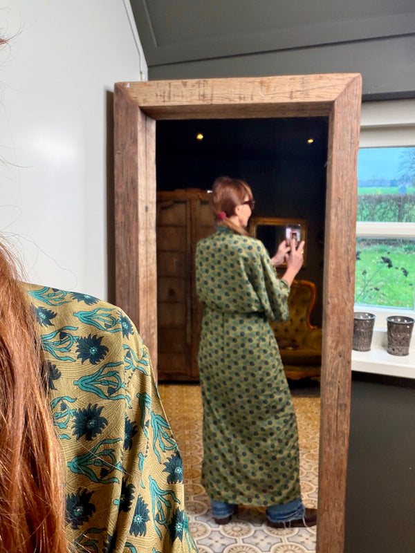 Wat deze kimono echt bijzonder maakt, is het gebruik van upcycled Sari zijde, gecombineerd met andere uitzonderlijk mooie stoffen. Dit betekent dat elke kimono een uniek meesterwerk is, met zijn eigen karakter en verhaal. Bij TwoSisters geloven we in duurzaamheid en het creëren van iets moois uit hergebruikte materialen. Met deze kimono draag je niet alleen een prachtig kledingstuk, maar ook een stukje ethische mode.