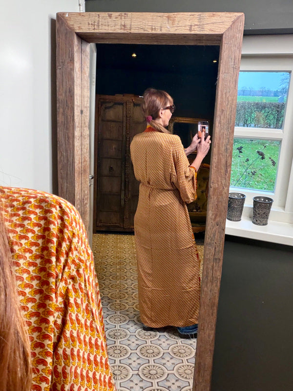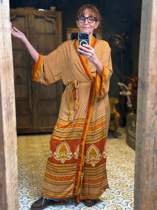 Wat deze kimono echt bijzonder maakt, is het gebruik van upcycled Sari zijde, gecombineerd met andere uitzonderlijk mooie stoffen. Dit betekent dat elke kimono een uniek meesterwerk is, met zijn eigen karakter en verhaal. Bij TwoSisters geloven we in duurzaamheid en het creëren van iets moois uit hergebruikte materialen. Met deze kimono draag je niet alleen een prachtig kledingstuk, maar ook een stukje ethische mode.