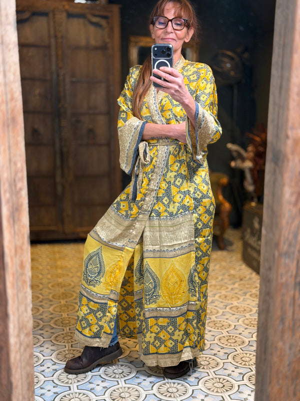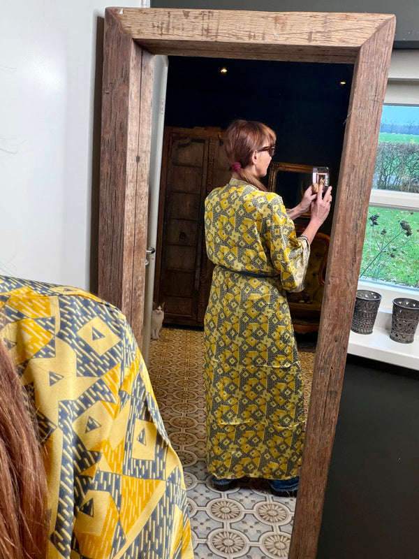 Wat deze kimono echt bijzonder maakt, is het gebruik van upcycled Sari zijde, gecombineerd met andere uitzonderlijk mooie stoffen. Dit betekent dat elke kimono een uniek meesterwerk is, met zijn eigen karakter en verhaal. Bij TwoSisters geloven we in duurzaamheid en het creëren van iets moois uit hergebruikte materialen. Met deze kimono draag je niet alleen een prachtig kledingstuk, maar ook een stukje ethische mode.