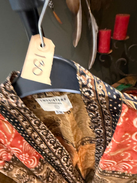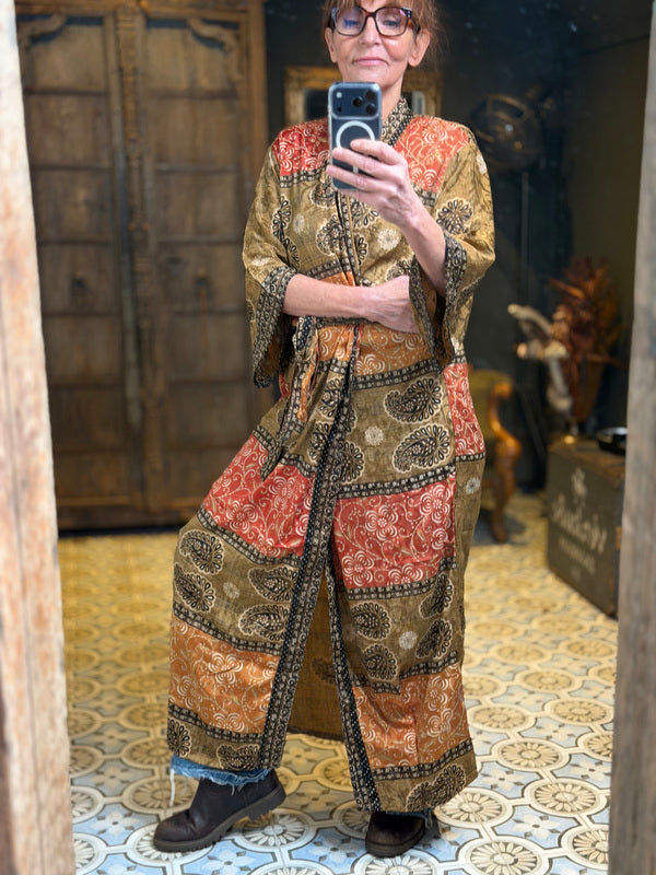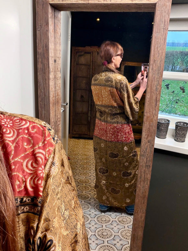 Wat deze kimono echt bijzonder maakt, is het gebruik van upcycled Sari zijde, gecombineerd met andere uitzonderlijk mooie stoffen. Dit betekent dat elke kimono een uniek meesterwerk is, met zijn eigen karakter en verhaal. Bij TwoSisters geloven we in duurzaamheid en het creëren van iets moois uit hergebruikte materialen. Met deze kimono draag je niet alleen een prachtig kledingstuk, maar ook een stukje ethische mode.