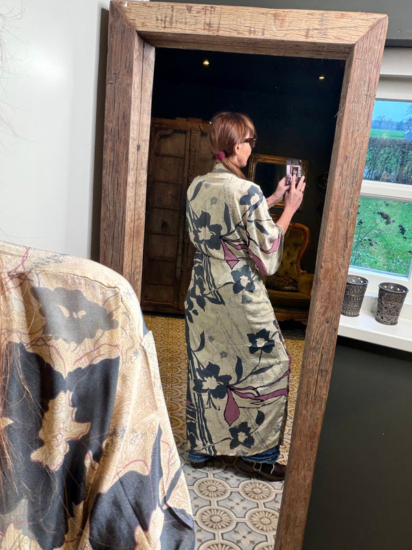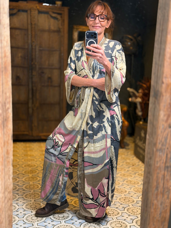 Wat deze kimono echt bijzonder maakt, is het gebruik van upcycled Sari zijde, gecombineerd met andere uitzonderlijk mooie stoffen. Dit betekent dat elke kimono een uniek meesterwerk is, met zijn eigen karakter en verhaal. Bij TwoSisters geloven we in duurzaamheid en het creëren van iets moois uit hergebruikte materialen. Met deze kimono draag je niet alleen een prachtig kledingstuk, maar ook een stukje ethische mode.