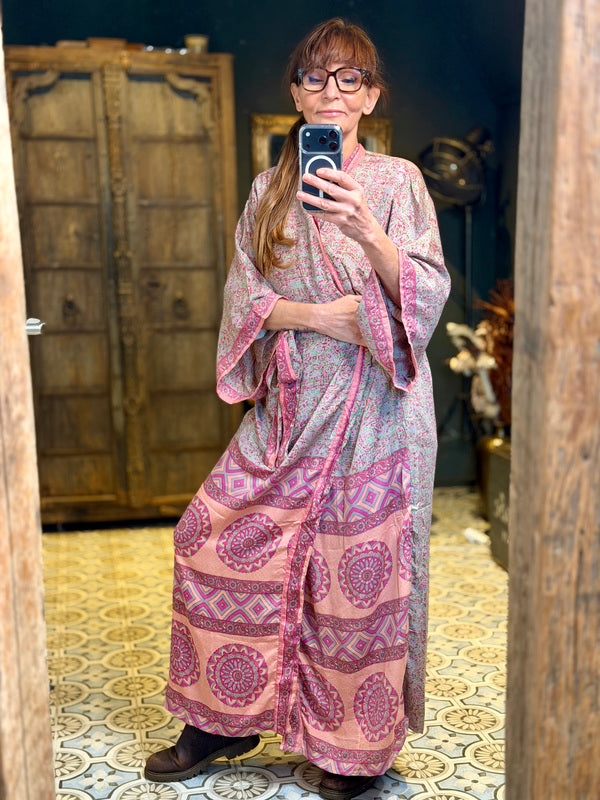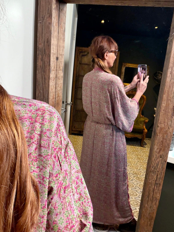 Wat deze kimono echt bijzonder maakt, is het gebruik van upcycled Sari zijde, gecombineerd met andere uitzonderlijk mooie stoffen. Dit betekent dat elke kimono een uniek meesterwerk is, met zijn eigen karakter en verhaal. Bij TwoSisters geloven we in duurzaamheid en het creëren van iets moois uit hergebruikte materialen. Met deze kimono draag je niet alleen een prachtig kledingstuk, maar ook een stukje ethische mode.