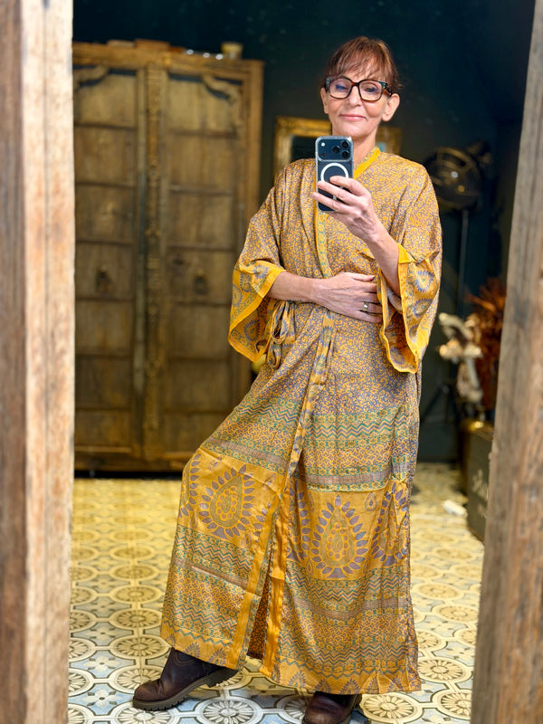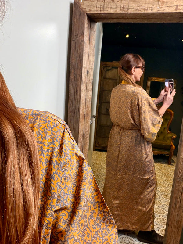 Wat deze kimono echt bijzonder maakt, is het gebruik van upcycled Sari zijde, gecombineerd met andere uitzonderlijk mooie stoffen. Dit betekent dat elke kimono een uniek meesterwerk is, met zijn eigen karakter en verhaal. Bij TwoSisters geloven we in duurzaamheid en het creëren van iets moois uit hergebruikte materialen. Met deze kimono draag je niet alleen een prachtig kledingstuk, maar ook een stukje ethische mode.