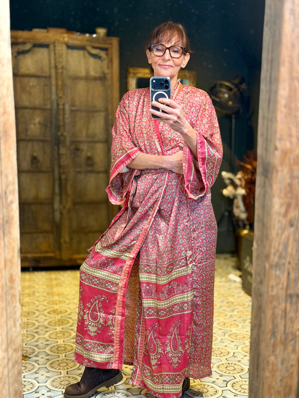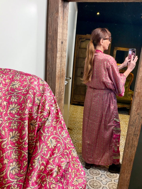 Wat deze kimono echt bijzonder maakt, is het gebruik van upcycled Sari zijde, gecombineerd met andere uitzonderlijk mooie stoffen. Dit betekent dat elke kimono een uniek meesterwerk is, met zijn eigen karakter en verhaal. Bij TwoSisters geloven we in duurzaamheid en het creëren van iets moois uit hergebruikte materialen. Met deze kimono draag je niet alleen een prachtig kledingstuk, maar ook een stukje ethische mode.