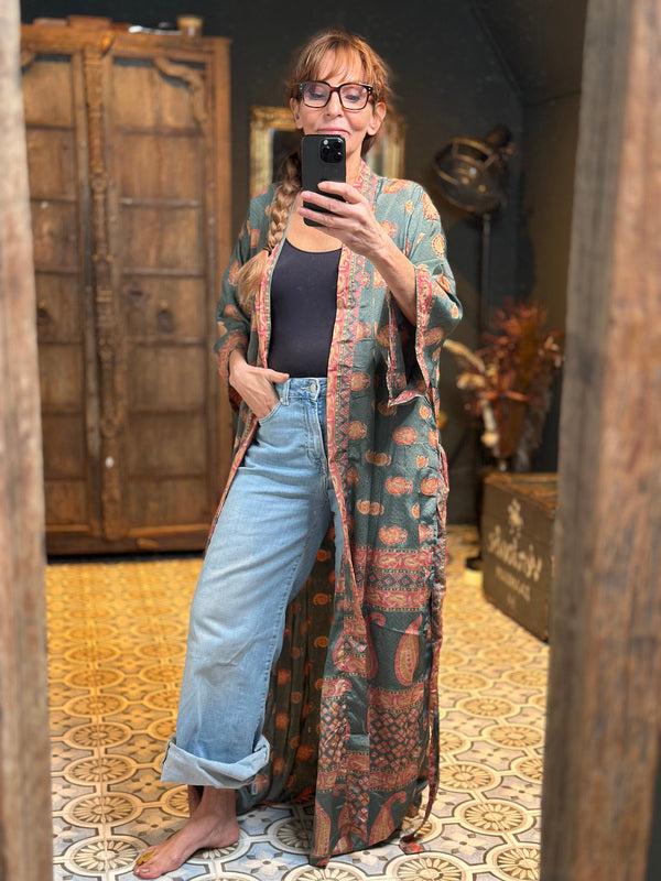 Wat deze kimono echt bijzonder maakt, is het gebruik van upcycled Sari zijde, gecombineerd met andere uitzonderlijk mooie stoffen. Dit betekent dat elke kimono een uniek meesterwerk is, met zijn eigen karakter en verhaal. Bij TwoSisters geloven we in duurzaamheid en het creëren van iets moois uit hergebruikte materialen. Met deze kimono draag je niet alleen een prachtig kledingstuk, maar ook een stukje ethische mode.
