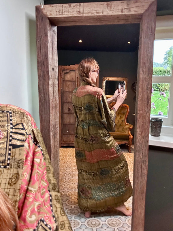 Wat deze kimono echt bijzonder maakt, is het gebruik van upcycled Sari zijde, gecombineerd met andere uitzonderlijk mooie stoffen. Dit betekent dat elke kimono een uniek meesterwerk is, met zijn eigen karakter en verhaal. Bij TwoSisters geloven we in duurzaamheid en het creëren van iets moois uit hergebruikte materialen. Met deze kimono draag je niet alleen een prachtig kledingstuk, maar ook een stukje ethische mode.