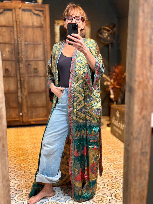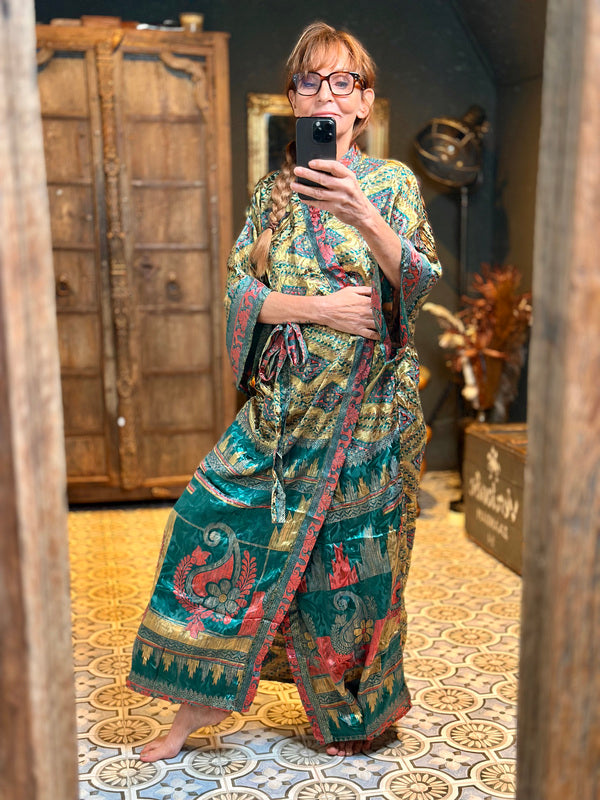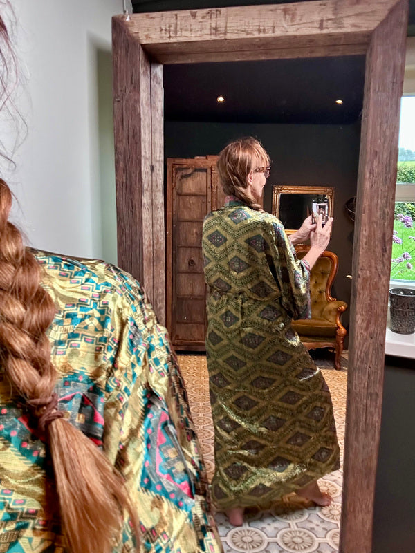 Wat deze kimono echt bijzonder maakt, is het gebruik van upcycled Sari zijde, gecombineerd met andere uitzonderlijk mooie stoffen. Dit betekent dat elke kimono een uniek meesterwerk is, met zijn eigen karakter en verhaal. Bij TwoSisters geloven we in duurzaamheid en het creëren van iets moois uit hergebruikte materialen. Met deze kimono draag je niet alleen een prachtig kledingstuk, maar ook een stukje ethische mode.